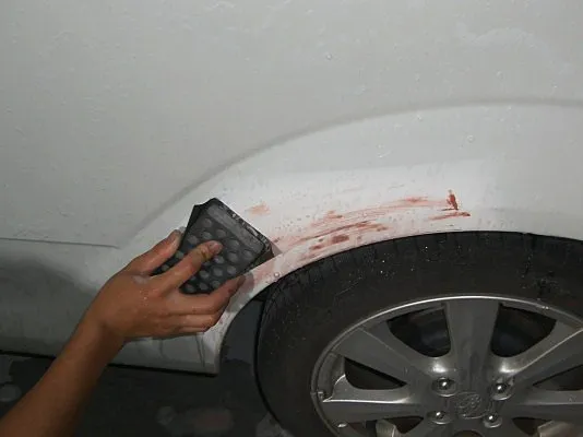 キズ及びヘコミ部分の塗装を剥ぎ落とします。