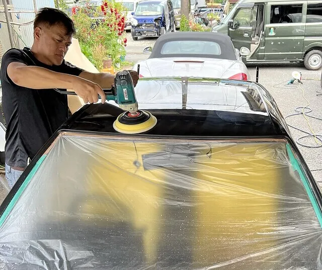今回は、全塗装依頼のルーフのみの画像となるためフロント&リアガラスのモールも交換のためガラス脱着をようする内容となります。