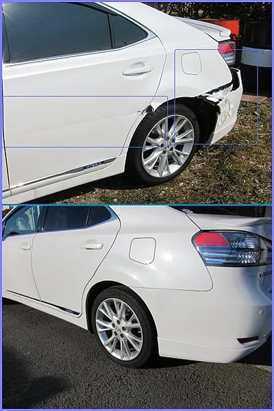 クォーターの鉄部分が切れて跳ね上がってしまいましたが板金の修理をさせて頂きました。リヤバンパーは切れが大きかったので新品にて交換致しました。
