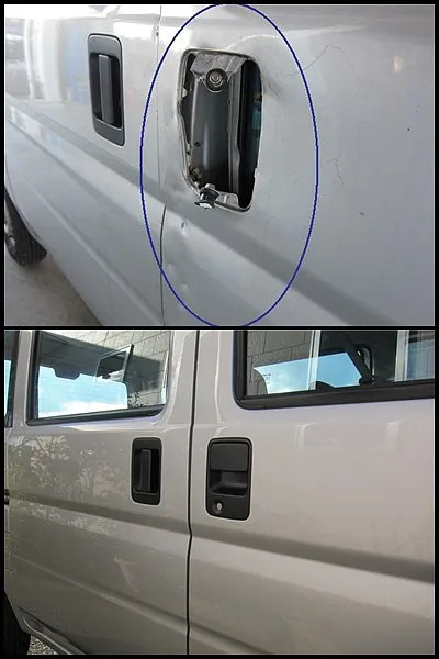 出先で車上荒らしに、あわれたお客様で運転席のドアノブが壊されていました。ノブの取付部やその周辺がヘコミ変形しています。