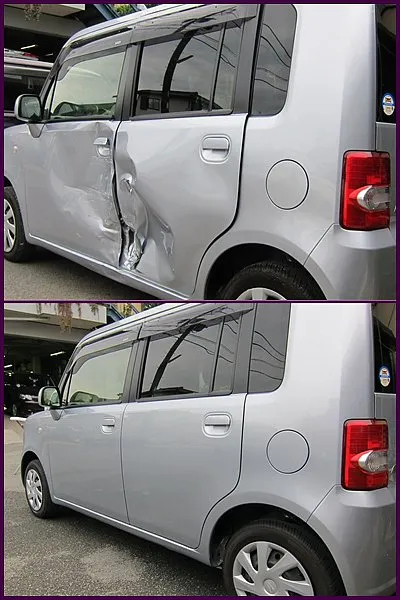 左・前後のドアの凹みがひどかったのですが車両保険に加入していたため、お客様とご相談の上、部品交換にて対応させて頂きました。
