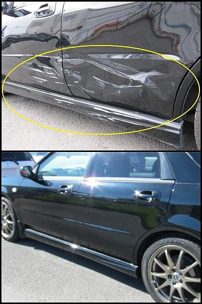 駐車場内、左折時に左下の障害物に気がつかずフロントドアからリヤドアにかけてぶつけてしまいました。
