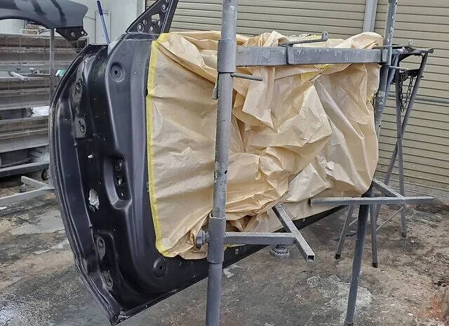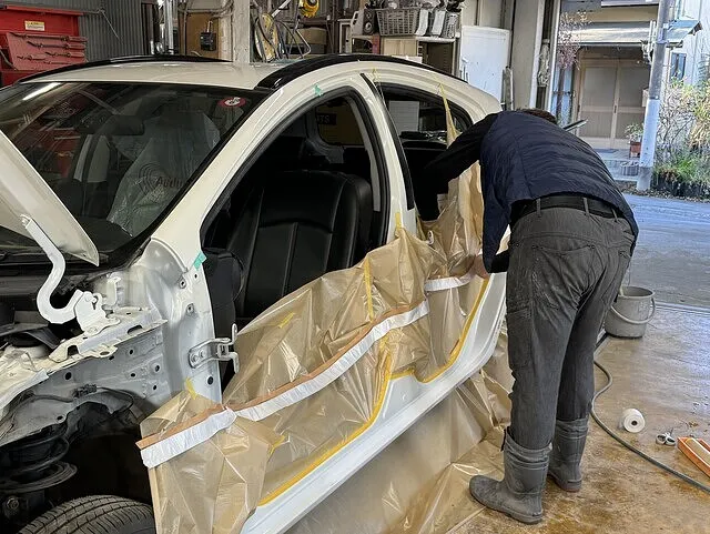 塗装を吹き付けている際に他箇所に塗装が飛んで付かないようにマスキングを施す作業です。