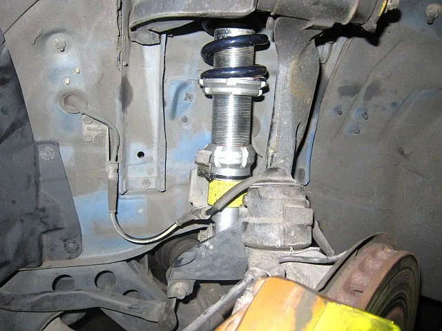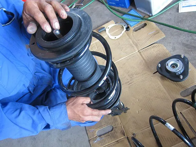 フロント作業中の写真となります。ショックアブソーバー本体を外しバネのみを交換します。完了後再度車体へ・・・。